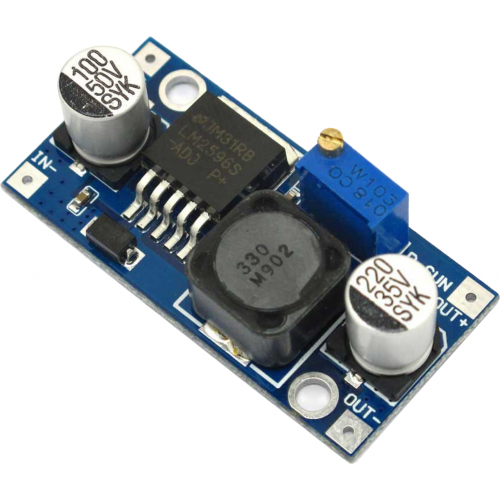 DC to DC Converter Power Module features a wide input voltage range and an adjustable output voltage with a maximum current output of 3A. This module uses the popular LM2596 switching voltage regulator chip combined with low ESR filter capacitors for improved output regulation. The module has been assembled using machine placement parts and reflow soldering for added reliability.